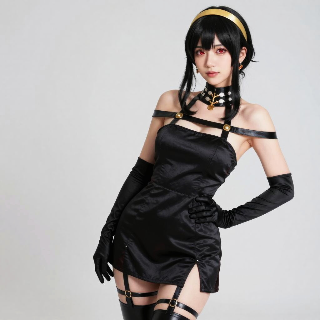 Portrait of a woman with black hair and red eyes wearing a stylish black off-shoulder dress with thigh straps and long black gloves. She accessorizes with a gold hairband, matching choker necklace with floral detail, and earrings. The woman poses confidently with one hand on her hip against a plain white background.