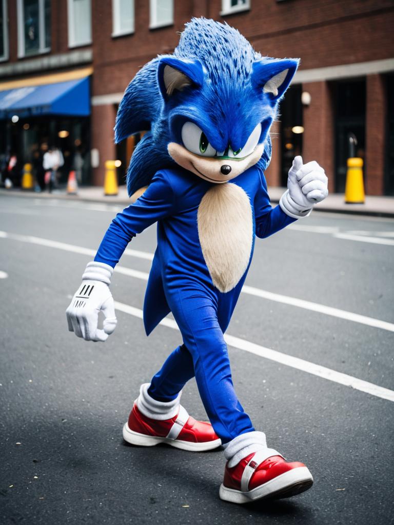 Man in Sonic the Hedgehog Costume, full-body cosplay photo in action pose