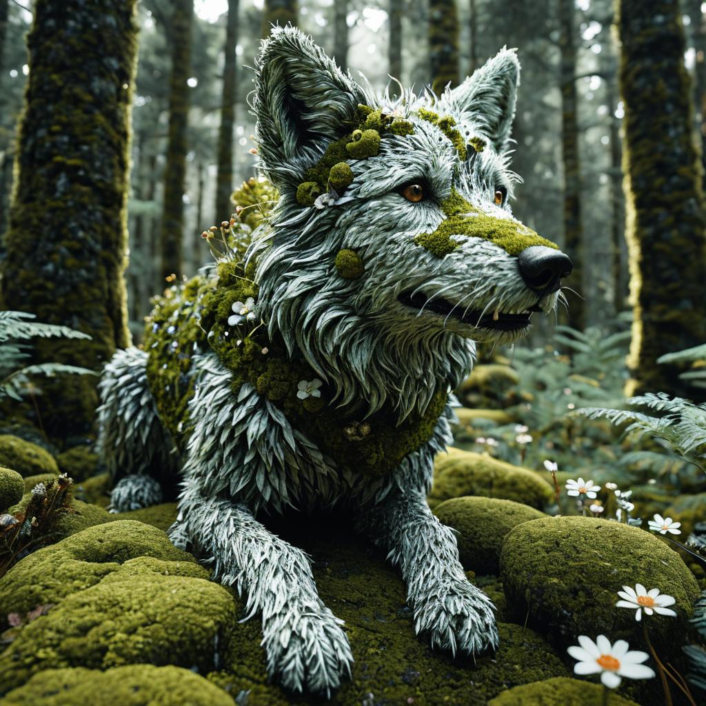 Ultra-realistic and hyper-detailed sculpture of a wolf covered in moss and lichen, set in a lush forest environment. The wolf's textured fur and mossy elements are intricately rendered using advanced 3D techniques, surrounded by green mossy rocks and white wildflowers. The scene exhibits cinematic and nature-inspired visual effects.