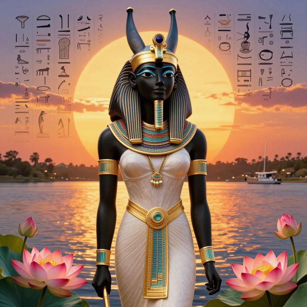 Black Egyptian goddess standing majestically by the Nile, adorned with golden jewelry and traditional pharaoh headdress, surrounded by ancient hieroglyphics and vibrant lotus flowers, glowing under a mystical sunset sky, detailed and ornate art style.