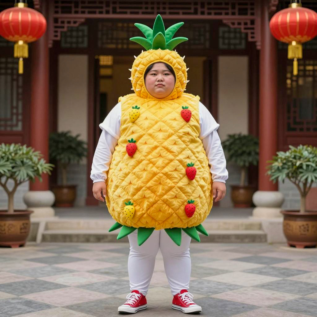 Plus size fruit costume, photograph of person wearing fruit costume, pineapple outfit with yellow body, green leafy bottom, red and yellow fruit embellishments, white sleeves, red sneakers, indoors, ornate background, archway, red lanterns, checkered floor, potted plants, traditional style, realistic, full body shot