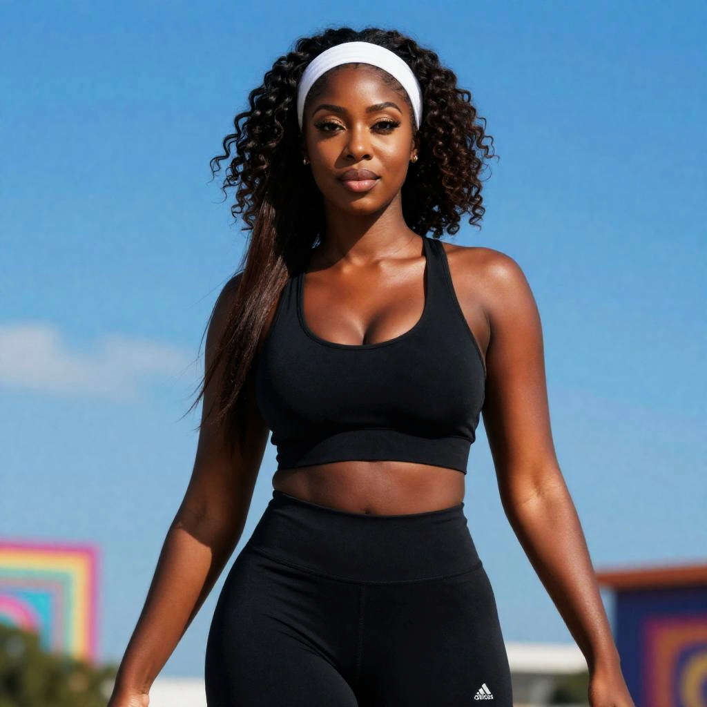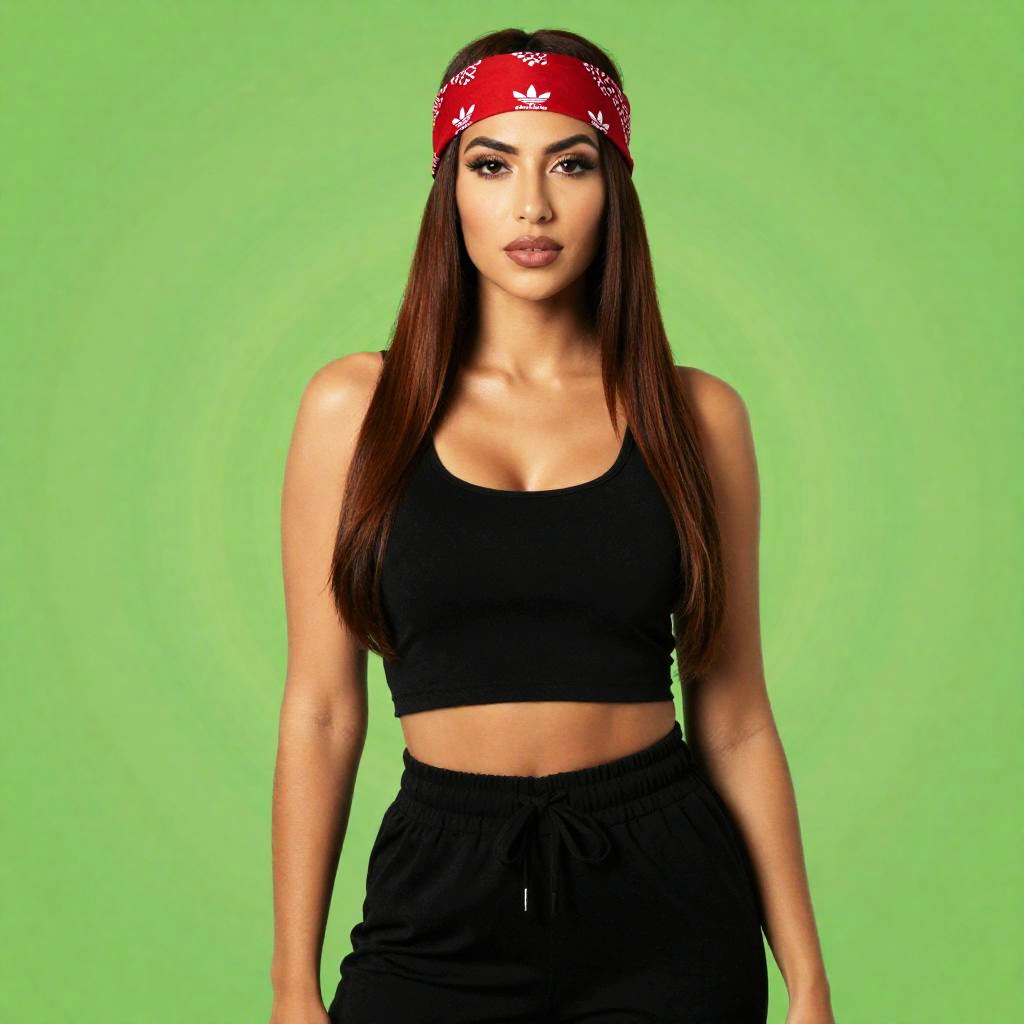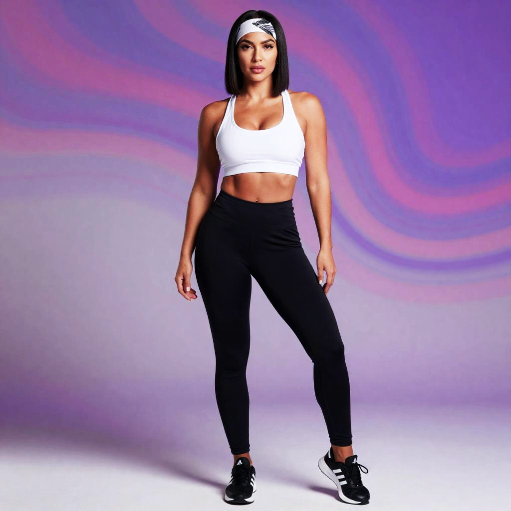Real sharp focus,bold,high quality, vibrant, professional photography ,a realistic feminine elegant,HD, Diamond face,slim, Curvy body, Golden tan skin,full luscious lips Mixed Latina and Caucasian face, wearing Black Adidas sports bra with matching tapered pants, Red bandana tied around the neck showing off her Loose wavy dark auburn hair revealing extra large cleavage curvy body lady lumps phychedelic background with magenta and cyan swirls full body shot