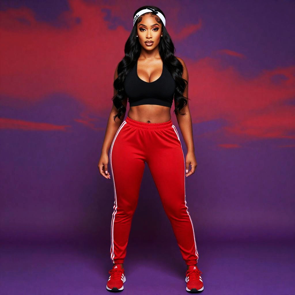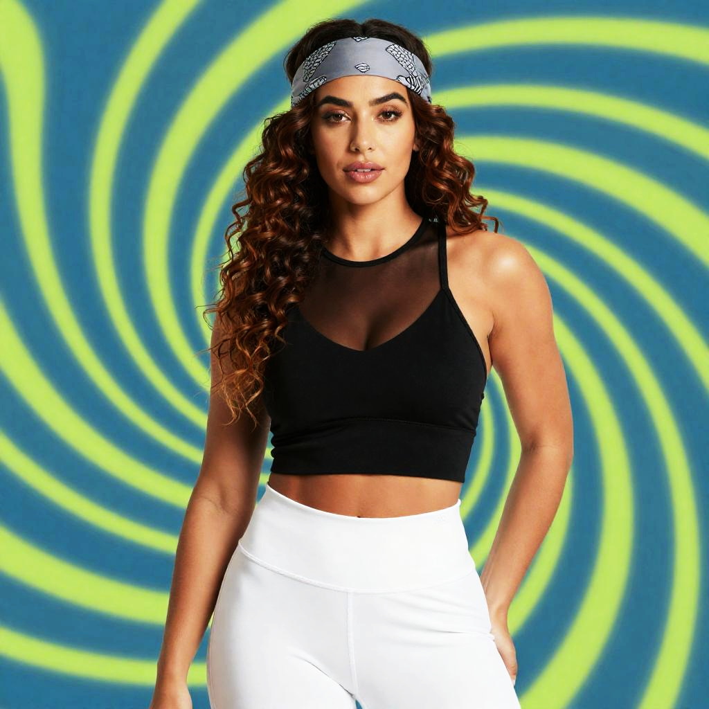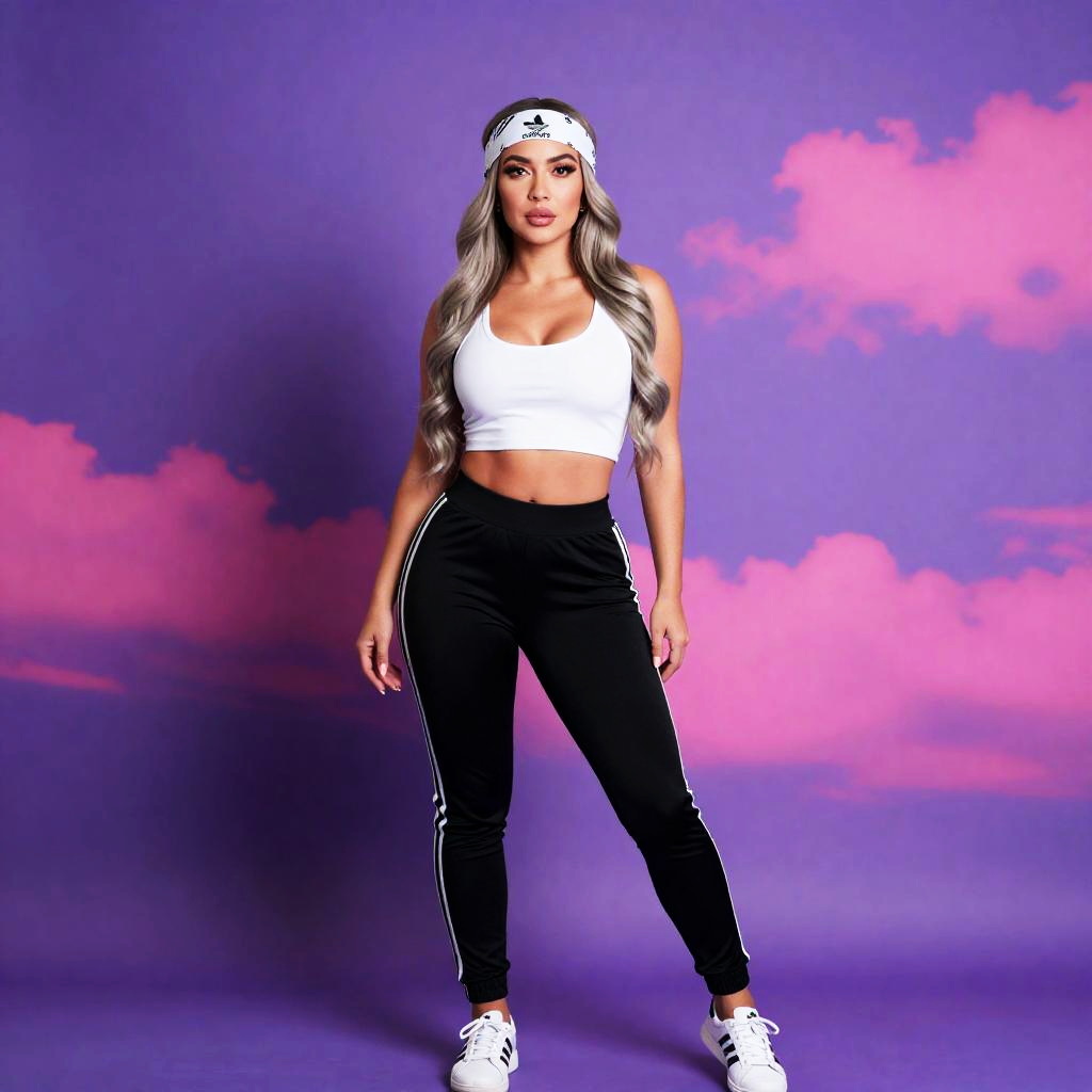 Real sharp focus,bold,high quality, vibrant, professional photography ,a realistic feminine elegant,HD, Diamond face,slim, Curvy body, Golden tan skin,full luscious lips Mixed Latina and Caucasian face, wearing Black Adidas sports bra with matching tapered pants, Red bandana tied around the neck showing off her Loose wavy dark auburn hair revealing extra large cleavage curvy body lady lumps phychedelic background with magenta and cyan swirls full body shot