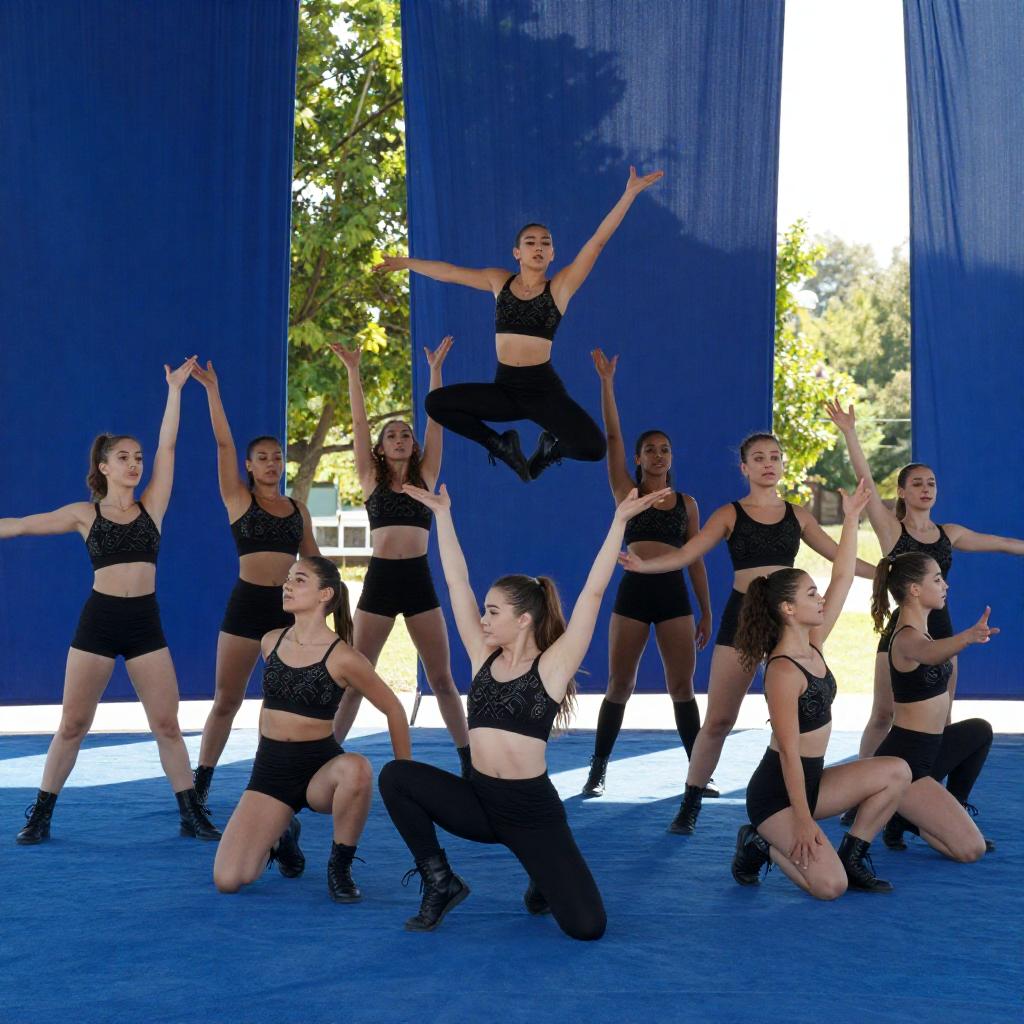 Photograph of a dynamic outdoor dance performance. Eleven female dancers in black, patterned, midriff-baring outfits and black boots perform various acrobatic and energetic poses on a blue carpet. They are surrounded by large, blue, fabric drapes. One dancer is suspended mid-air, while others kneel, stand, or leap. The background includes green trees and a bright, sunny sky.
