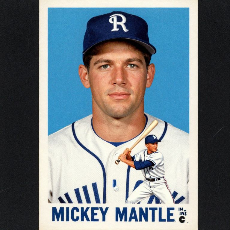 Vintage baseball card featuring Mickey Mantle in his New York Yankees uniform, with a detailed portrait of his face above a smaller illustration of him batting, set against a bright blue background and labeled \"MICKEY MANTLE IN NE C.GILNHTI.\