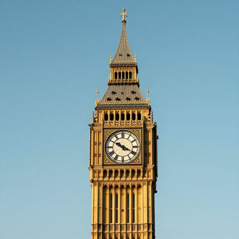 Photograph of the iconic Big Ben clock tower against a clear blue sky, showcasing its detailed Gothic architecture and prominent clock face.