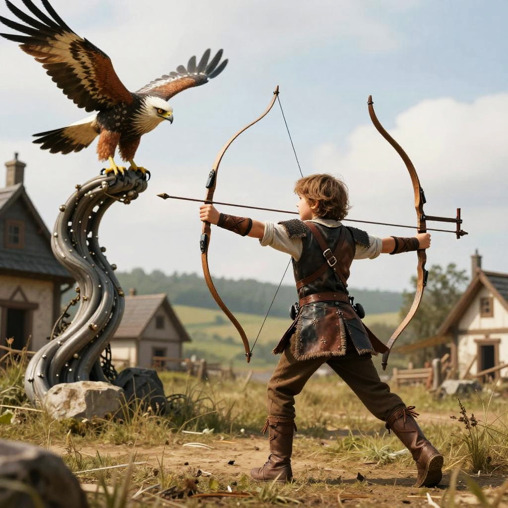 A child archer fleeing from a mechanical hawk, dressed in a patched leather jerkin, situated in a village outskirts, portrayed as a movie action still, featuring an ultra-wide horizon, showcasing intricate and elegant details, hyperrealistic digital art, concept artwork, smooth textures, and sharp focus, influenced by the styles of Artgerm, Greg Rutkowski, Ilya Kuvshinov, and Alphonse Mucha.