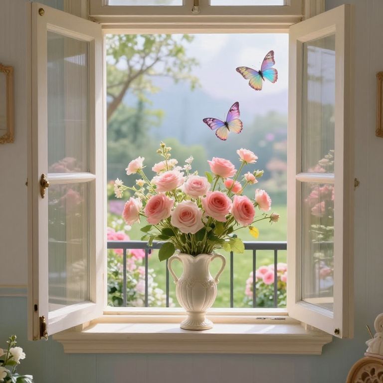 A beautiful Victorian-style windowsill with a balcony vase of romantic pastel-colored flowers, a magical iridescent butterfly, and a dreamy fairyland scene in the background.
