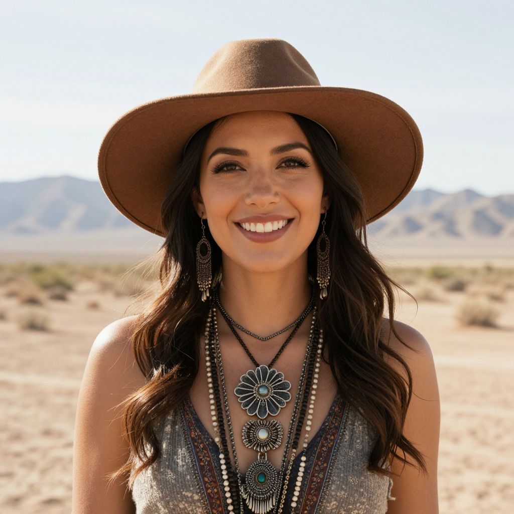 Smiling woman wearing a wide-brimmed brown hat and layered bohemian jewelry, including a prominent flower pendant necklace, stands against a desert backdrop with distant mountains and sparse vegetation.