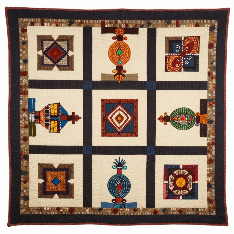 Photograph of a square, patchwork quilt featuring a grid of nine colorful blocks. Each block has unique geometric and symbolic designs, including diamonds, arrows, and abstract shapes. The quilt is bordered by a dark brown, patterned edge. The background fabric is cream, with black grid lines dividing the blocks. Blocks contain a mix of bright colors like red, blue, green, yellow, and orange, with intricate stitching details. The quilt's overall style is traditional with a modern twist, showcasing a blend of cultural and artistic influences.