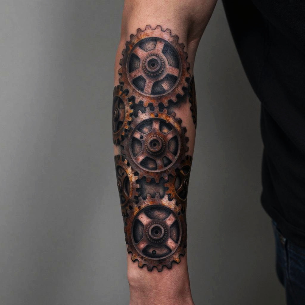 Flesh gear tattoo wrapped around a muscular forearm, steampunk aesthetics with rusted gears and cogs integrated into skin, realistic human anatomy, dramatic lighting