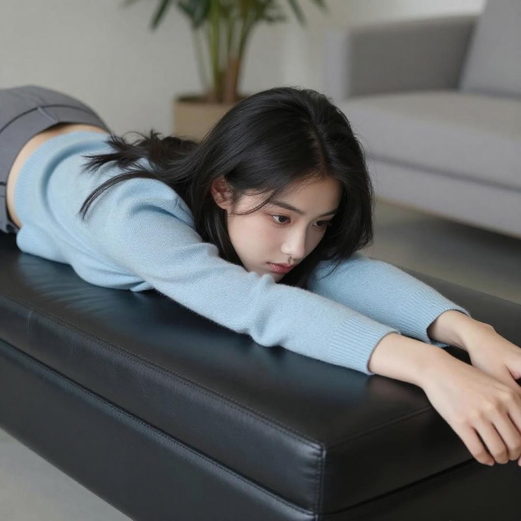 Photograph of a young woman with pale skin and black hair, lying on a brown leather chair. She wears a light blue long-sleeve shirt and a gray skirt, with black high heels. Her right arm rests on the chair's armrest, and her left arm is raised. A gray sofa and wooden bookshelf with books are in the background, along with a green potted plant.