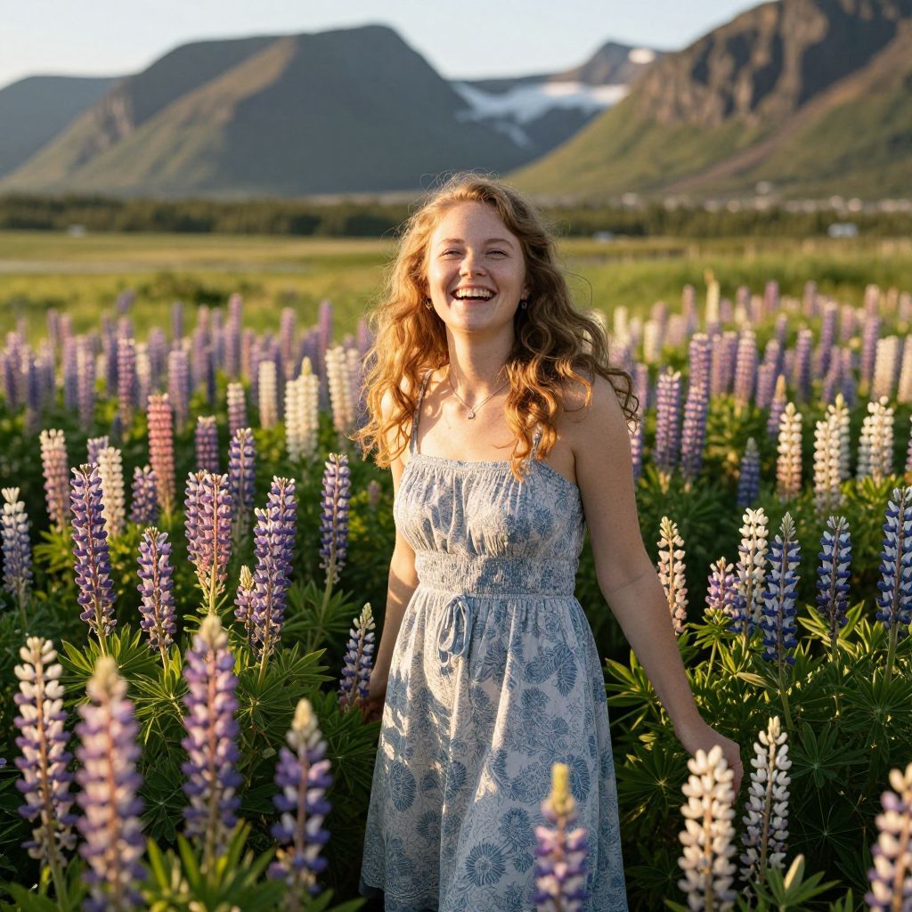 Radiant joy blooms amidst the lupines, as a woman's laughter intertwines with the warmth of the sun, embodying the ephemeral beauty and boundless freedom of a summer day on Kodiak Island.