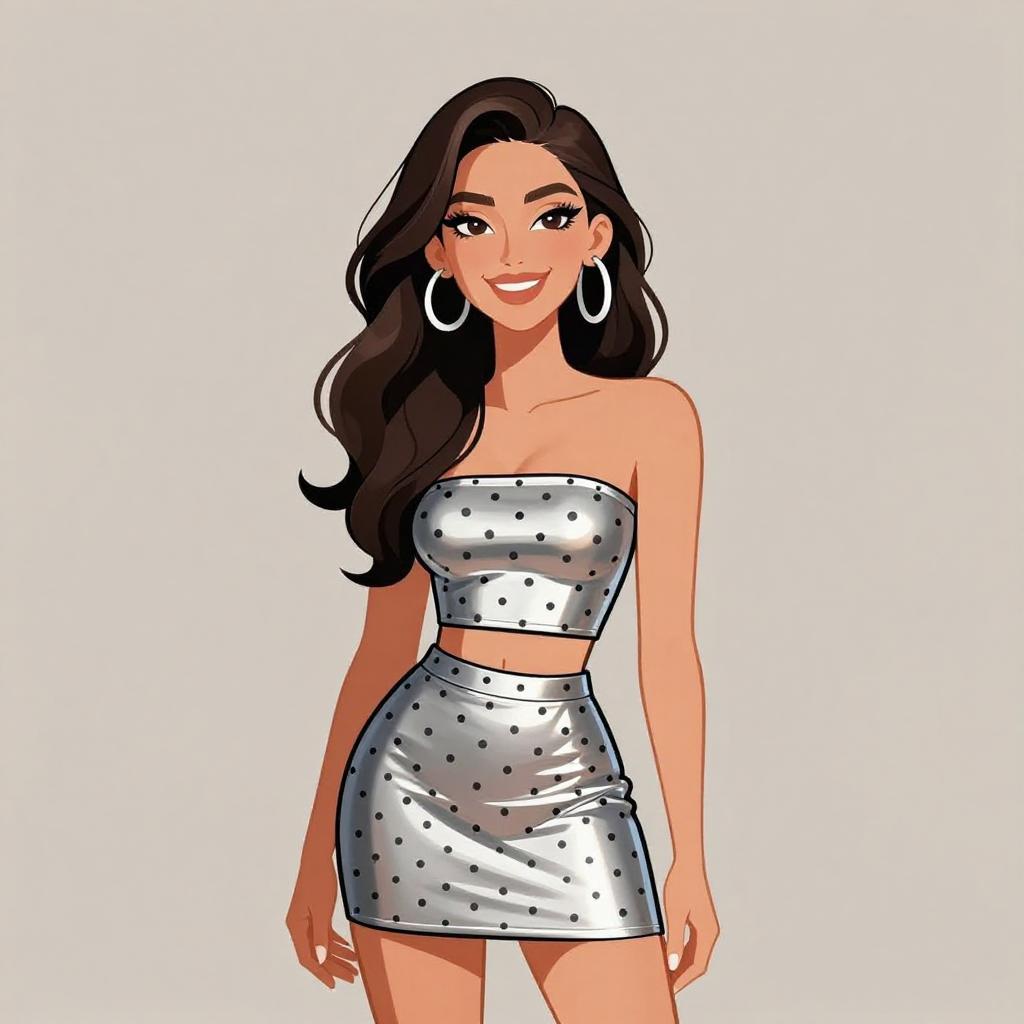 Woman with pretty face and pretty hair. smiling Woman, modern glam, metallic cropped top with high neckline, sleeveless, matching high-waisted mini skirt with pleats, oversized gold hoop earrings, sleek straight hair, plain white studio background. --sref 1467