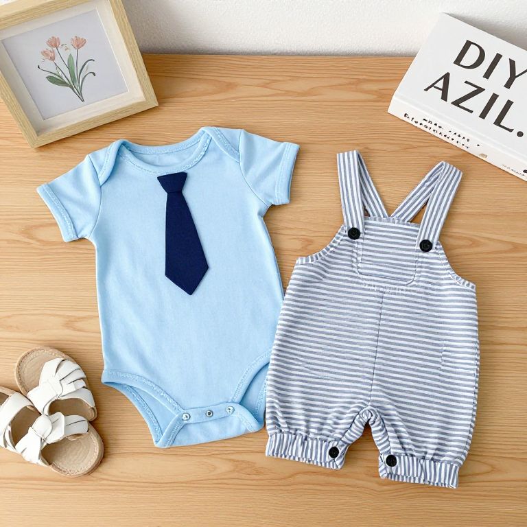 Neatly displayed on a wooden surface, two pieces of newborn clothing—a light blue short-sleeve onesie featuring a navy tie design and striped overalls with black buttons—sit alongside decorative elements including a white sandal, a framed floral arrangement, and a book titled \"DIY AZIL.\