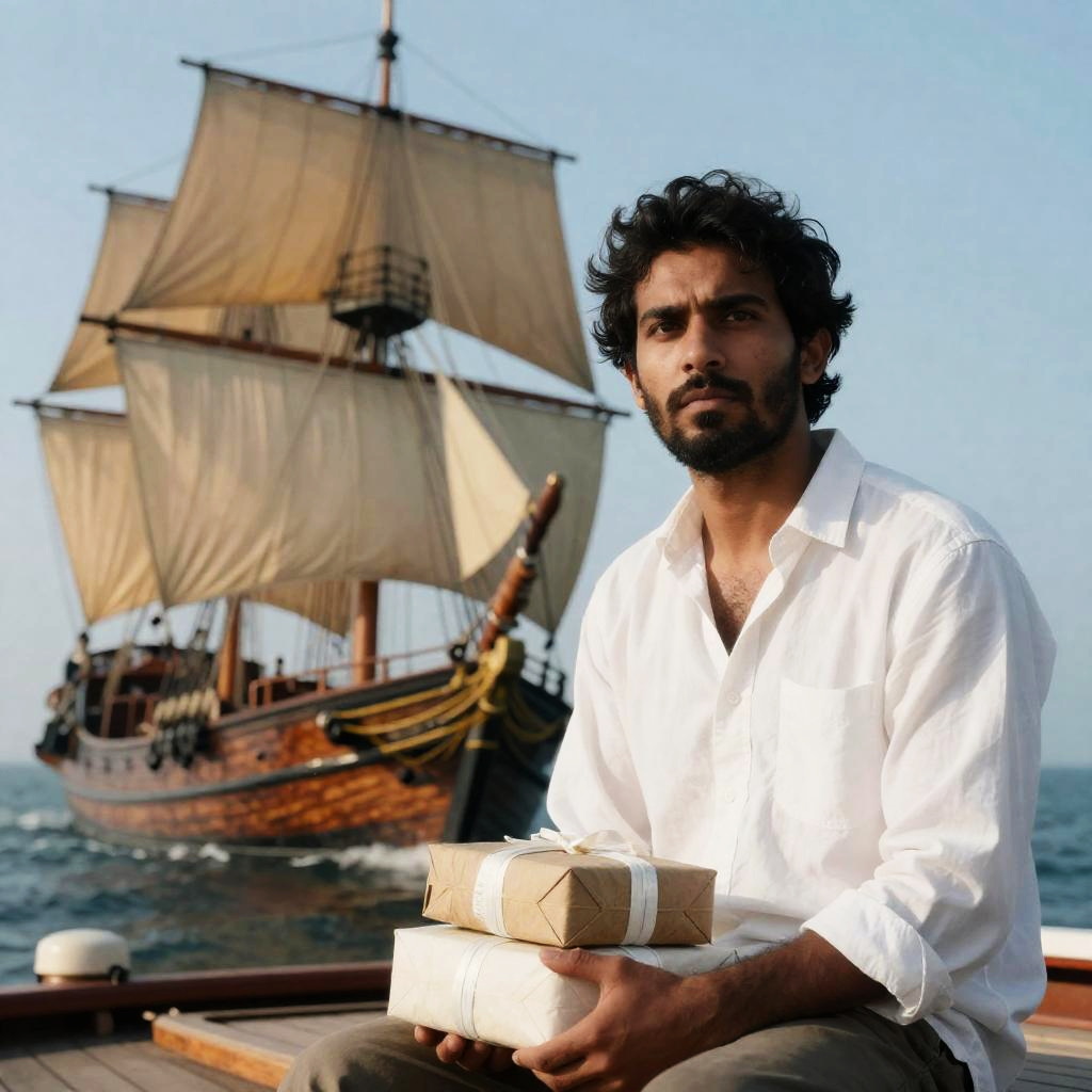 Photograph of a man with dark hair and beard, wearing a white long-sleeved shirt, sitting on a ship's deck. He looks forward with a serious expression. A large, wooden ship with yellow sails is in the background. He holds several wrapped items in his hands. The sky is clear and blue. The man is positioned to the right, ship to the left.