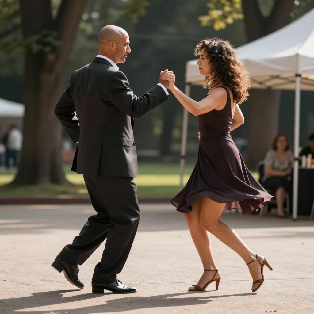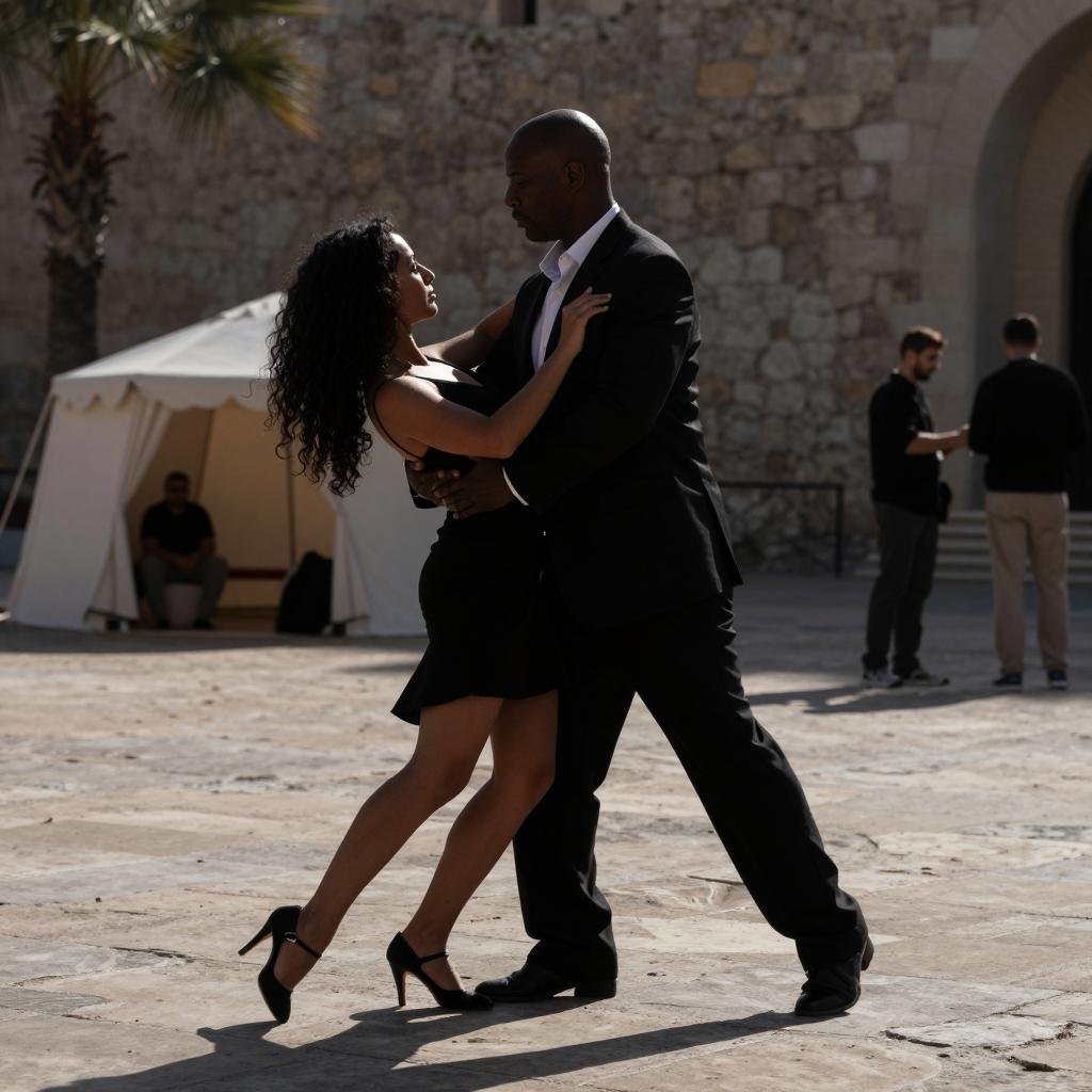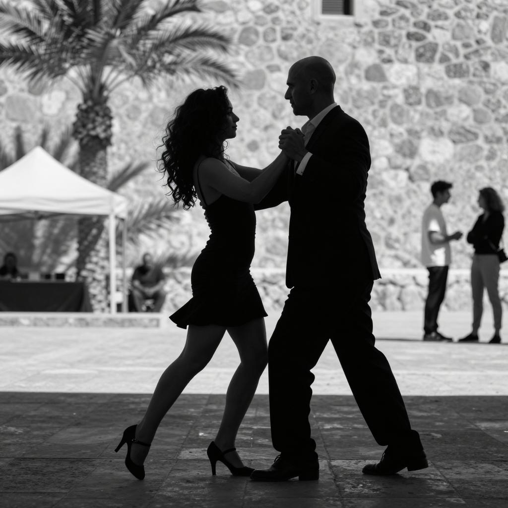 Black and white photograph. Silhouetted man and woman dancing in the foreground. Man in suit, bald, medium build. Woman in short dress, high heels, curly hair, slim. Background: stone wall, palm tree, small tent, distant figure sitting. Woman leaning forward, man standing upright. Strong shadows, dramatic lighting. Two other people in background.