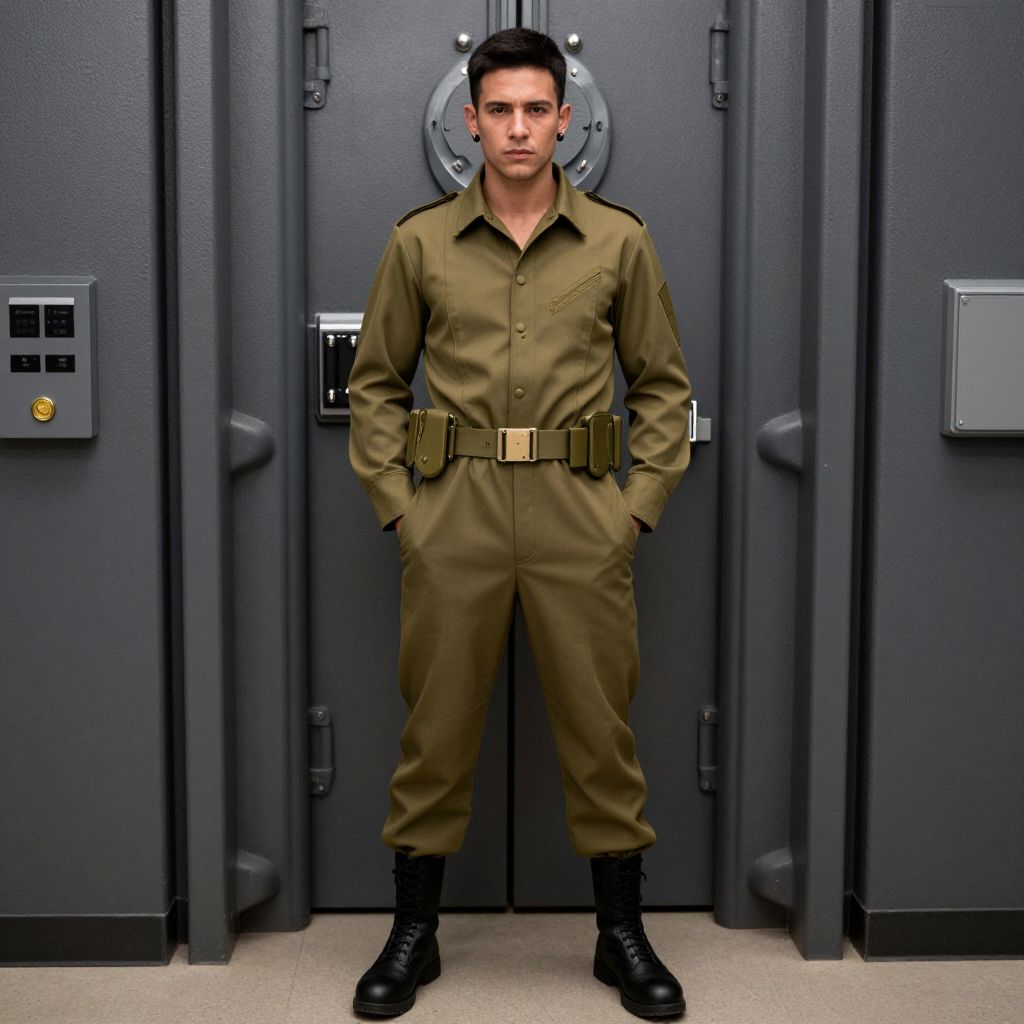 Fallout vault suit costume, 1boy, male focus, solo, realistic, hands in pockets, shield, earrings, belt, uniform, black hair, looking at viewer, military, military uniform