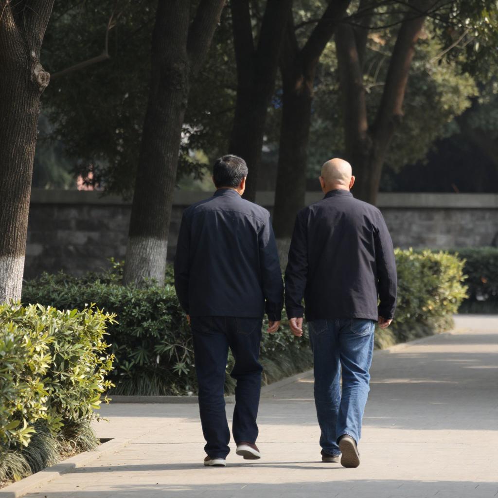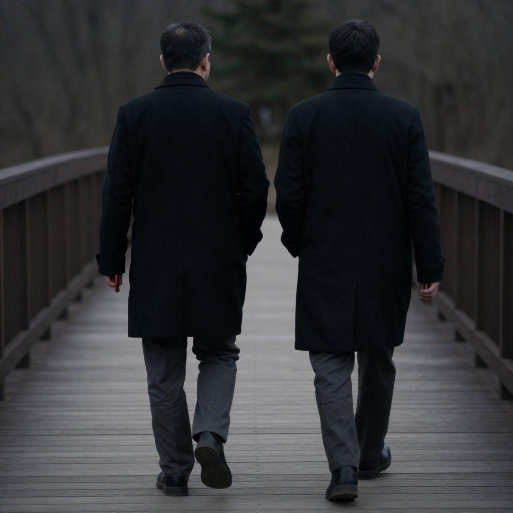 Photograph of two men walking side by side on a dark, wooden bridge. Both wear long black coats, gray trousers, and black shoes. The man on the left holds a red object in his right hand. The bridge has vertical wooden slats and a dim, moody atmosphere. The background shows blurred greenery.