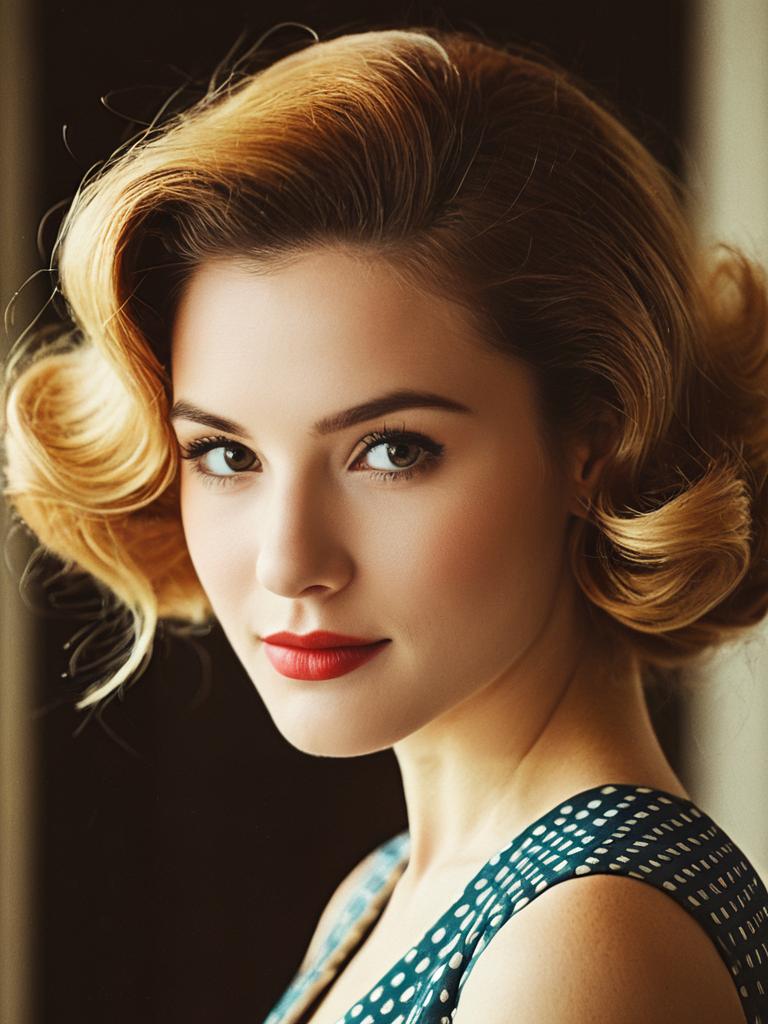 Woman in Retro Party Dress, close-up detailed headshot with retro hair --sref 1390