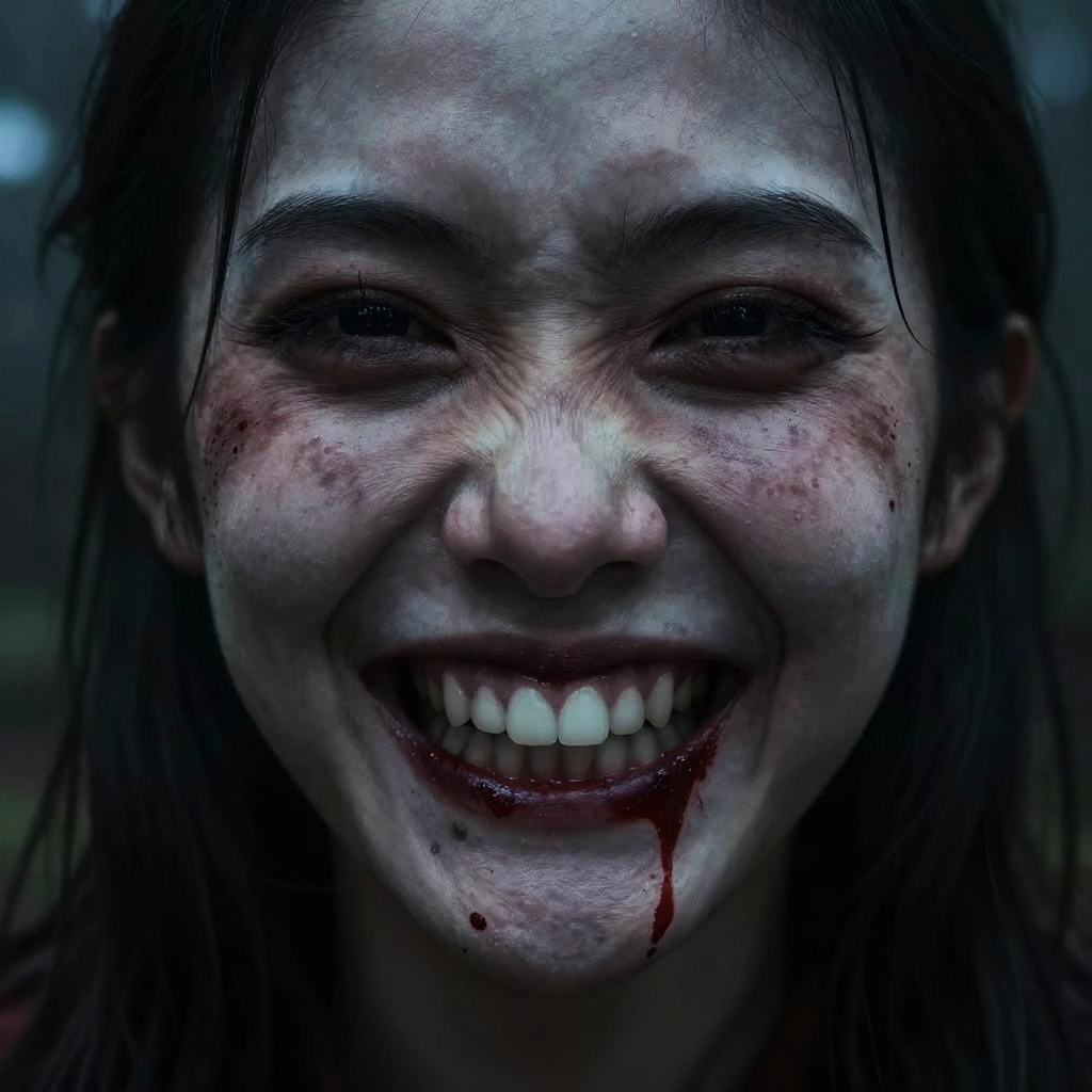 Close-up of a crazed smile in a horror theme, blood splatters on lips, haunting eyes staring intensely, dark foggy forest background, highly detailed, chilling atmosphere