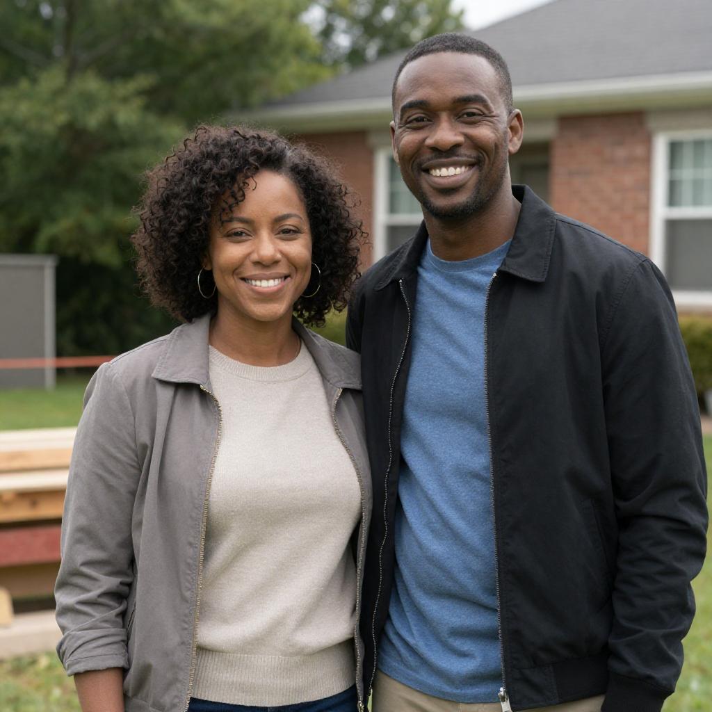 Photograph of a Black man and a Black woman in a dimly lit room. The man with a mustache, wearing a dark shirt, holds a sheet of paper, looking at it intently. The woman in a turquoise sleeveless top stands close, looking at him with a slight smile. Wooden shelves are in the background. Both have relaxed postures. The man's right hand holds the paper, his left arm rests on the woman's back. The woman's left hand rests on her hip. The background is blurred.