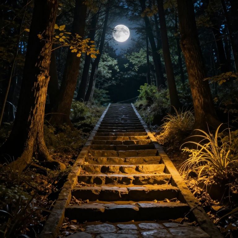 Under a luminous moon, a stone staircase bathed in golden light ascends through a mystical forest, inviting nocturnal wanderers into a realm where moonbeams and earthly paths converge in enchanting harmony.