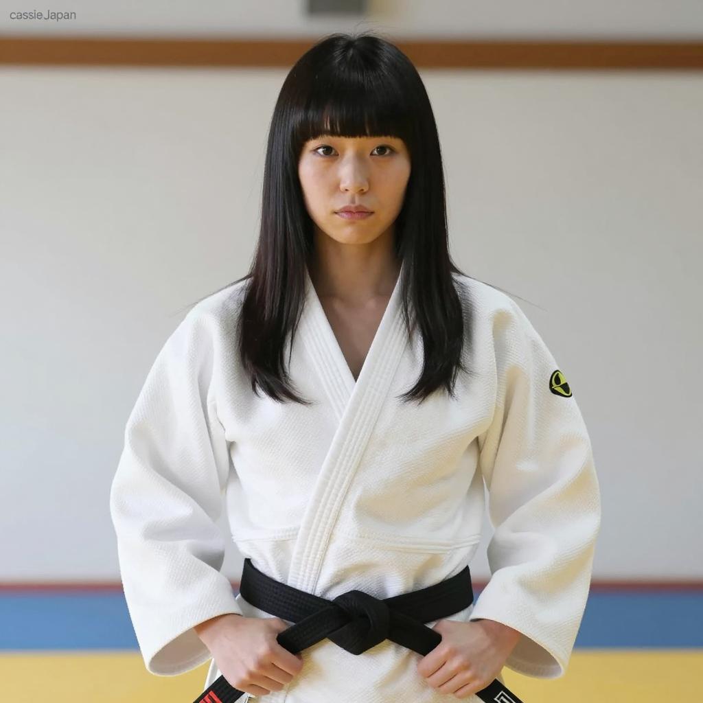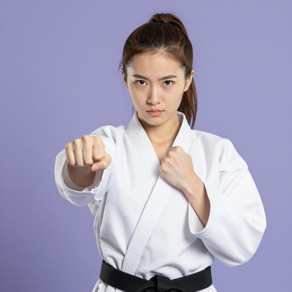 Asian woman with long black hair and blunt bangs wearing a white karate gi with a black belt, standing against a black background. She has her right arm raised, fist near her head. Black embroidery on the left chest area. Black belt with orange . She is looking at the camera with a neutral expression.