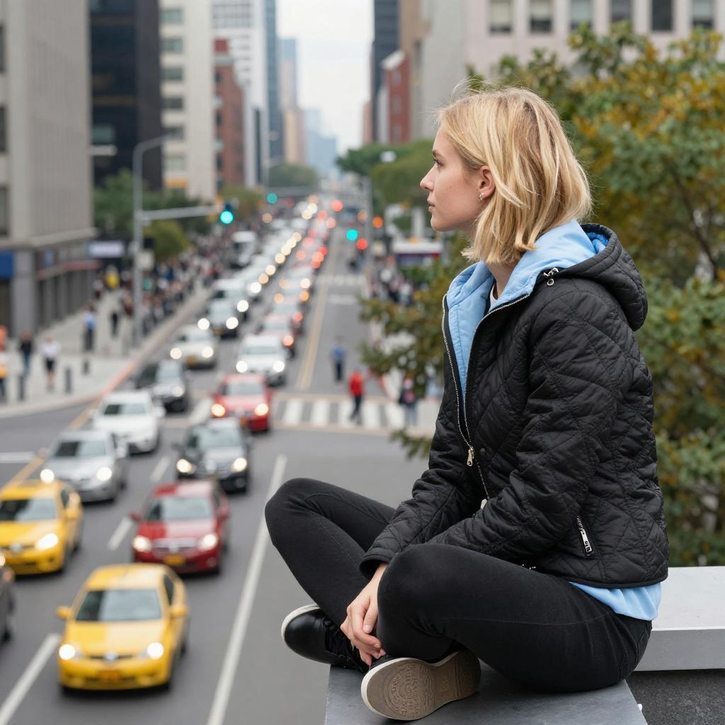 Photograph of a young blonde woman with fair skin, sitting cross-legged on a rooftop ledge, gazing at a bustling city street below. She's wearing a black, quilted jacket with a light blue inner lining and black pants. The background shows a crowded street filled with cars and a mix of yellow, red, and white vehicles. The city's buildings are blurred, with green trees on the right. The image has a vibrant, slightly overexposed style.