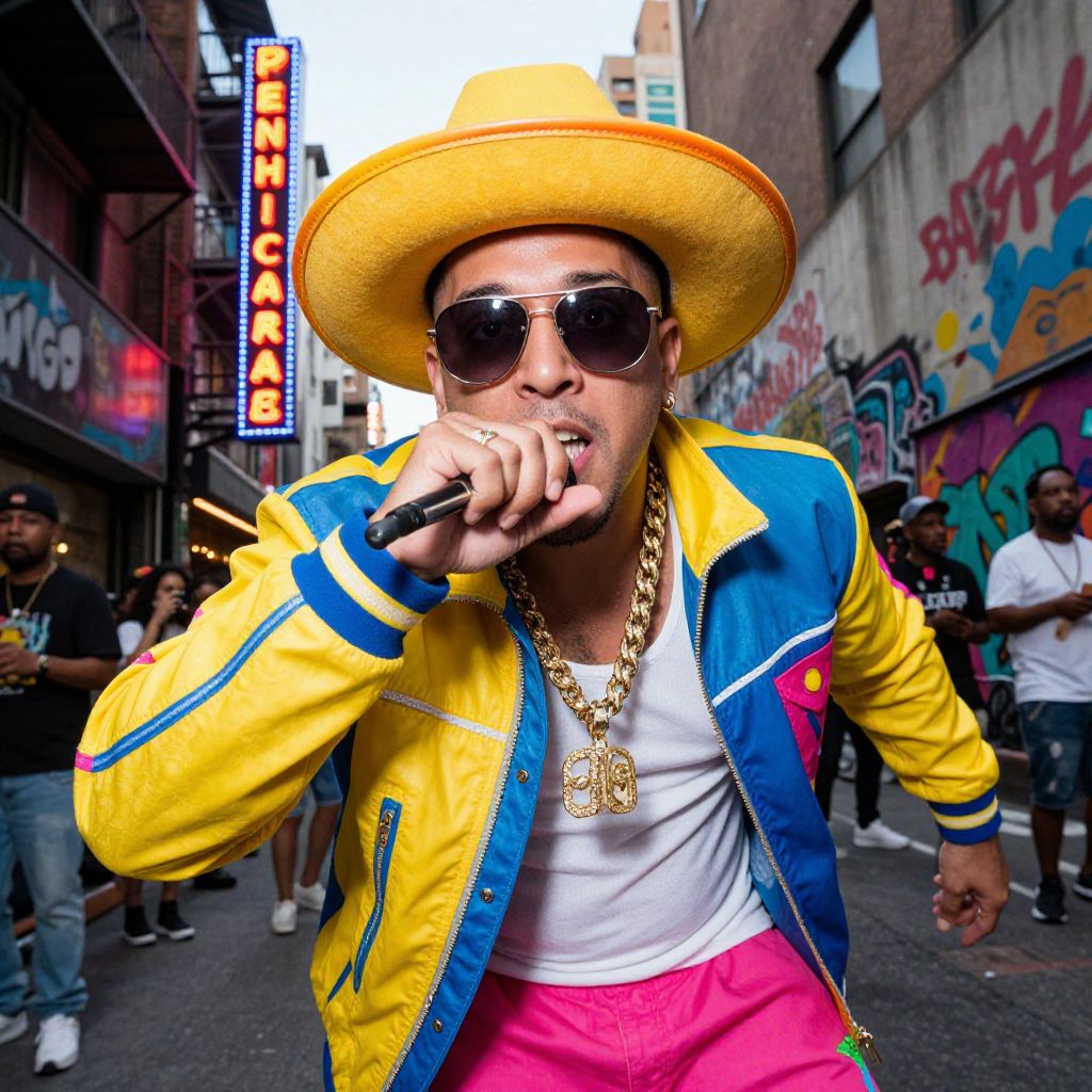 Photograph of a male rapper performing in a city alley, wearing a yellow hat, sunglasses, yellow-blue jacket, white tee, pink pants, gold