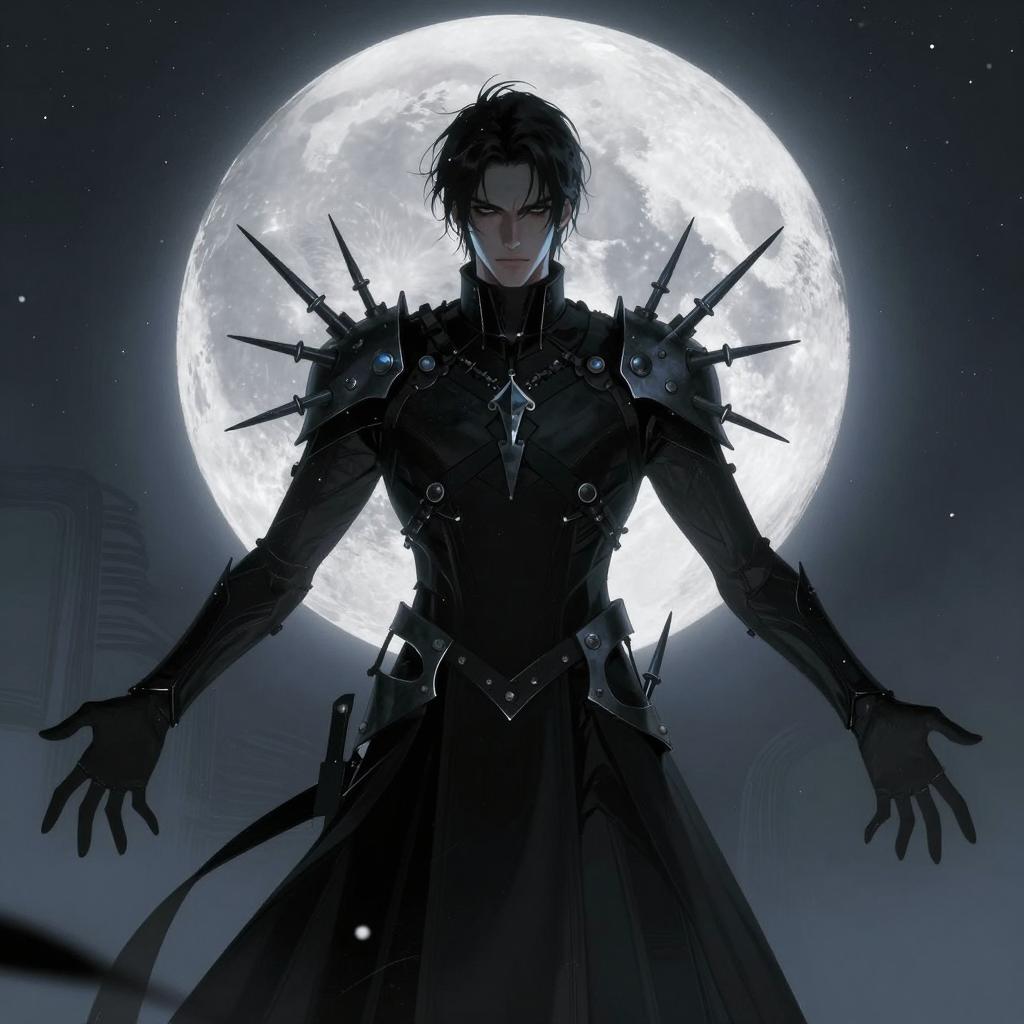 Digital illustration of a male character with pale skin and dark messy hair, wearing a black armored outfit adorned with sharp metal blades extending from the shoulders and arms. He stands with arms outstretched in front of a large glowing full moon. The background features abstract dark structures and falling snow, with a blue-toned color palette emphasizing a mystical nighttime atmosphere.