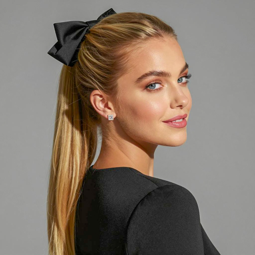 Blonde woman with long ponytail, black bow, wearing black top, square earrings with diamonds, blue eyes, pink lips, slight smile, light makeup, sunlit, gray background. Side profile, right face turned, head tilted slightly up. Photographic image.