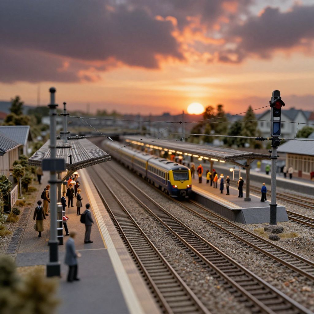 Detailed Noch scene of a bustling model railway station, intricate platforms with waiting passengers, signal posts, and overhead wires, under a dramatic sunset sky, capturing the dynamic and immersive world of model train enthusiasts.