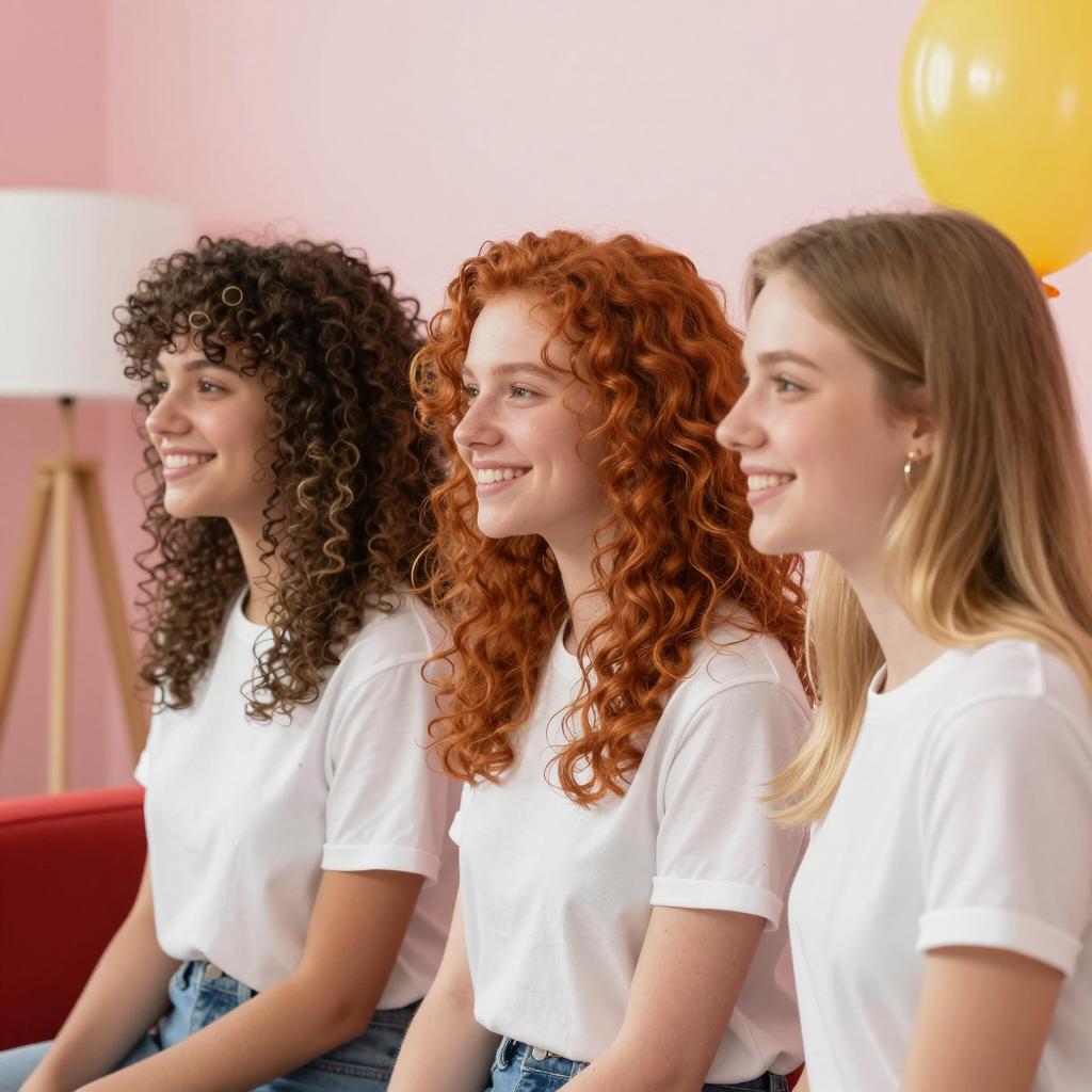 Four women in a brightly colored, turquoise room. Three women in pink shirts and checkered skirts, one in a red shirt and pink skirt. They are disassembling turquoise chairs. One woman sits on the floor with a neutral expression. Another stands to the left, one kneels to the right. Background features turquoise walls, ornate molding, and a window with pink light.