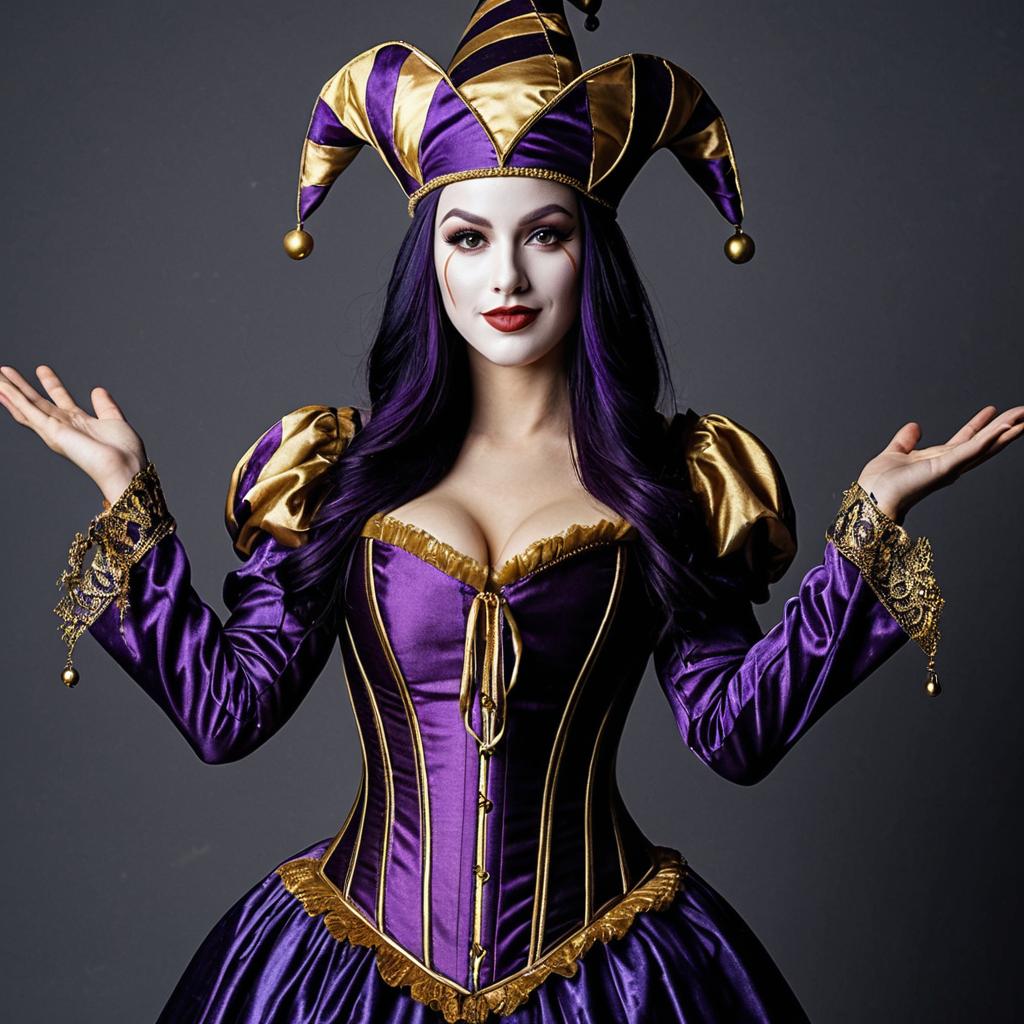 Photorealistic full body portrait of a blonde woman standing against a brick wall in an urban setting, wearing a colorful Mrs. Mayor Seussical costume. The outfit includes a purple dress with pink and white layers, red tights, a red collar with a blue bow, a matching purple and blue top hat with a feather, white gloves, black high heels, and a small purse. The woman is smiling with her hands on her hips, showcasing a playful and stylish cosplay look during daytime.