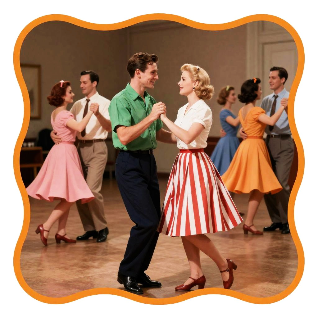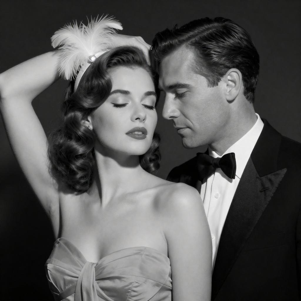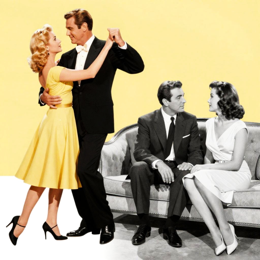Vintage movie poster. Tony Curtis in black suit, dancing with blonde woman in yellow dress, left. Black-and-white photograph of Curtis in suit, sitting on couch, talking to woman in white dress, right. Yellow background. Two people, one pair dancing, one pair sitting.
