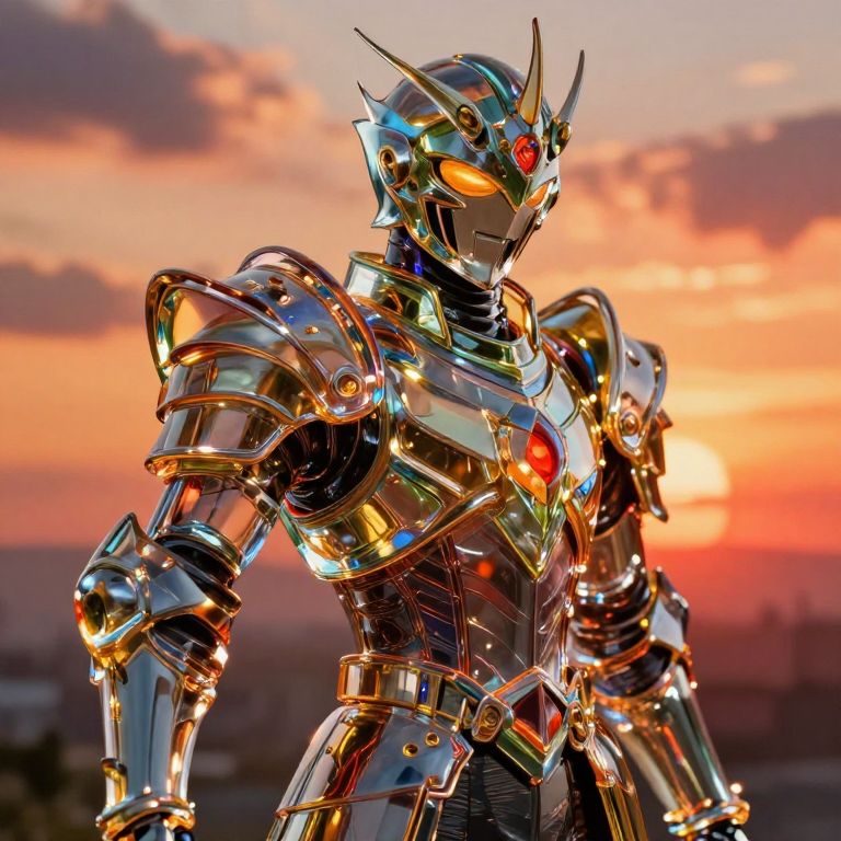 Glass painting anime artwork illustrating a heroic figure in armor, created with vibrant transparent shades and rich shadows, the glass texture emphasizing depth and light refraction, set in a dramatic sunset background with glowing highlights.