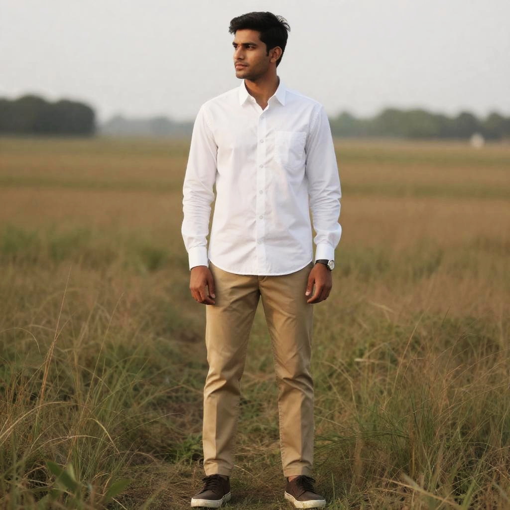 A photograph of a young South Asian man standing in a grassy field. He has short, dark hair and a trimmed beard. He wears a crisp, white long-sleeve button-up shirt, beige trousers, and black shoes. His stance is relaxed with arms slightly apart and eyes looking to the right. The background features an expansive field with tall, dry grass and a blurred horizon line, suggesting a rural setting. The lighting is natural, with a soft, even glow. The overall composition highlights the man's casual yet composed presence against the simple, earthy landscape.