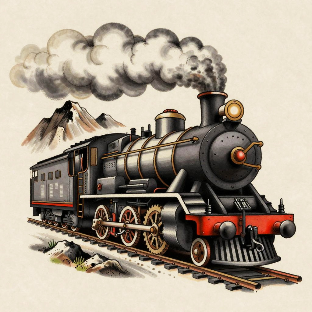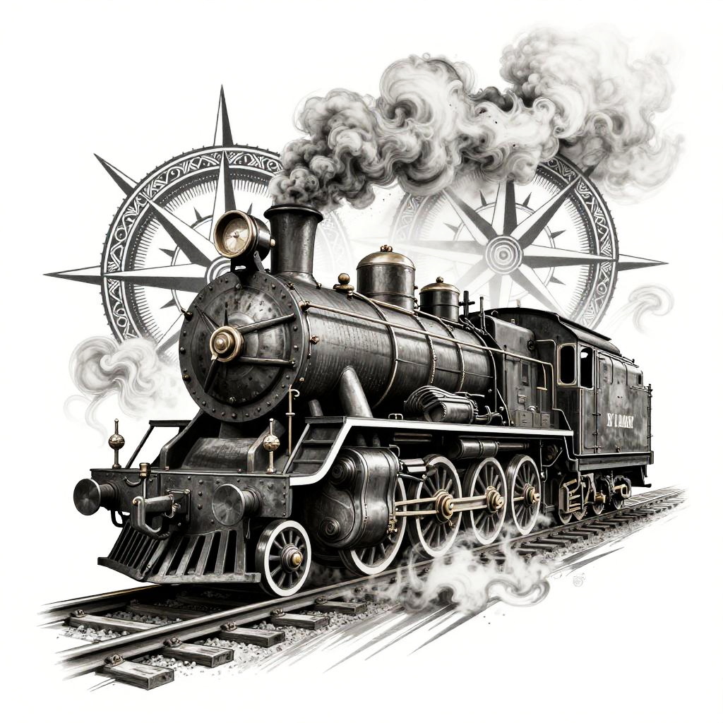 Vintage steam locomotive tattoo with dynamic perspective, steam and smoke swirling around ornate compass and railway tracks, blending elements of realism and illustrative styles, designed with sharp contrasts and detailed textures to evoke a sense of adventure and nostalgia.
