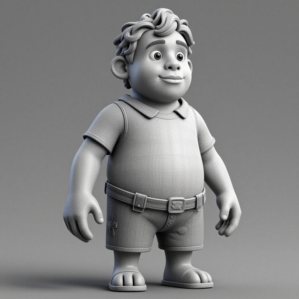 This is a digital CGI image of a cartoon-style, three-dimensional character. The character is a chubby, smiling boy with curly hair, wearing a short-sleeved, textured polo shirt and matching shorts with a belt. He has large, expressive eyes and a friendly expression. The figure is rendered in a monochromatic blue-gray color scheme, with detailed texture on the clothing and smooth skin. The background is a simple gradient gray, keeping the focus on the character. The overall style is playful and whimsical, with a slight 3D effect that adds depth and dimension to the figure.