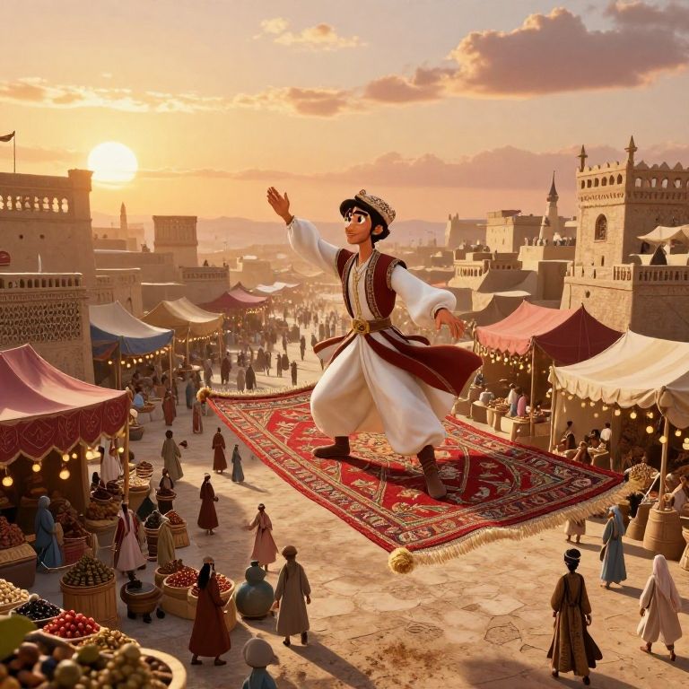 Aladin riding a magical carpet above a fantastical Arabian marketplace bustling with colorful tents, exotic spices, and lively merchants, rich textures and detailed character designs, warm sunset light, magical realism style