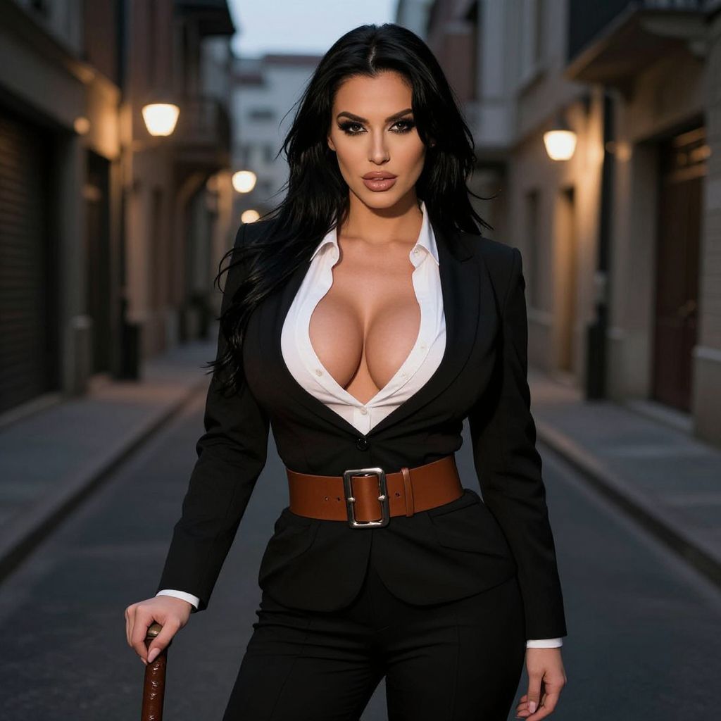 Photograph of a confident woman with long, wavy black hair and olive skin, standing in a dimly lit, narrow alleyway with street lamps in the background. She has striking makeup with dark eyeliner and red lipstick. She's wearing a black suit with a deep V-neck white blouse that reveals significant cleavage, accentuating her large breasts. A wide brown belt with a large buckle cinches her waist. She holds a brown leather strap in her right hand. The alleyway has a slightly blurred, urban European vibe with brick buildings on either side. The image has a slightly exaggerated, hyper-realistic style.