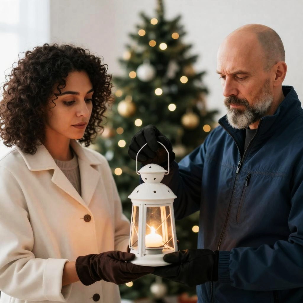 Middle-aged man with gray hair and beard, wearing black suit and tie, holds ornate glass hourglass over wooden box. Background includes lit fireplace, green garland, and wooden paneling. Man's expression is focused. Christmas decorations on table in foreground.