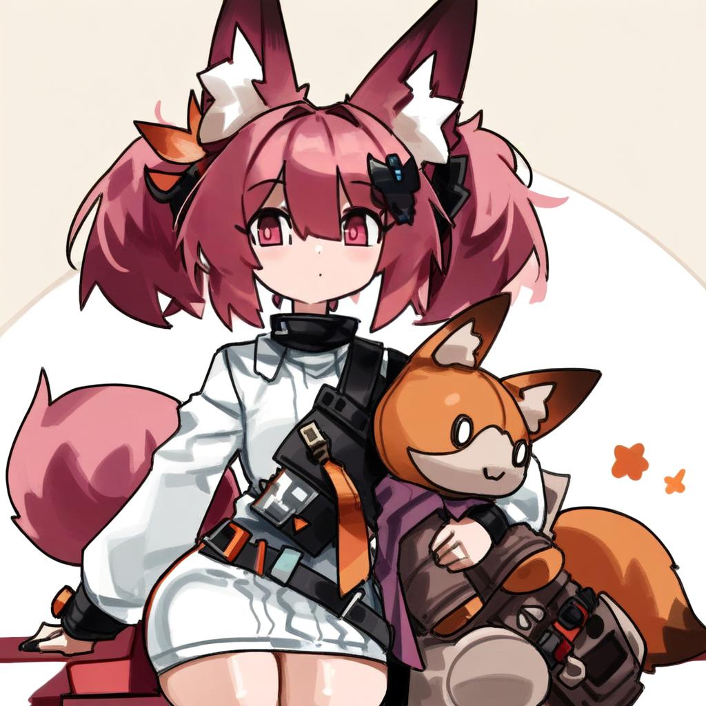 Morte (arknights), arknights, 1girl, fox girl, animal ear fluff, fox ears, fox tail, hair between eyes, pink eyes, red eyes, pink hair, short hair, purple hair, twintails, hair ornament, white shirt, stuffed animal, by artist sumiyao (amam), animagine