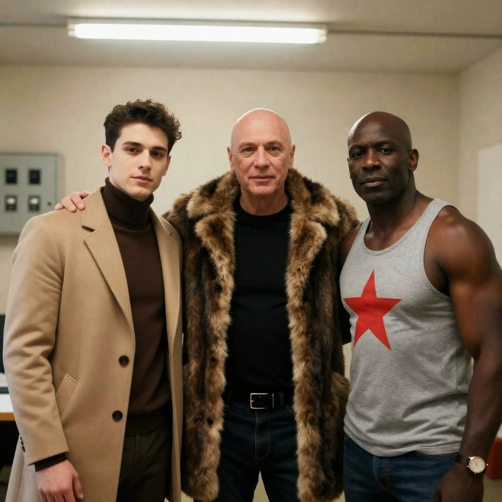 Photograph of three men standing together indoors. Left: young man with short dark hair, beige coat, brown turtleneck. Center: older man with balding head, fur coat, black shirt. Right: bald man with dark skin, muscular, gray tank top, red star graphic. Center man's arm around left man's shoulder. Background: beige walls, fluorescent light, electrical panel. All men have neutral expressions.