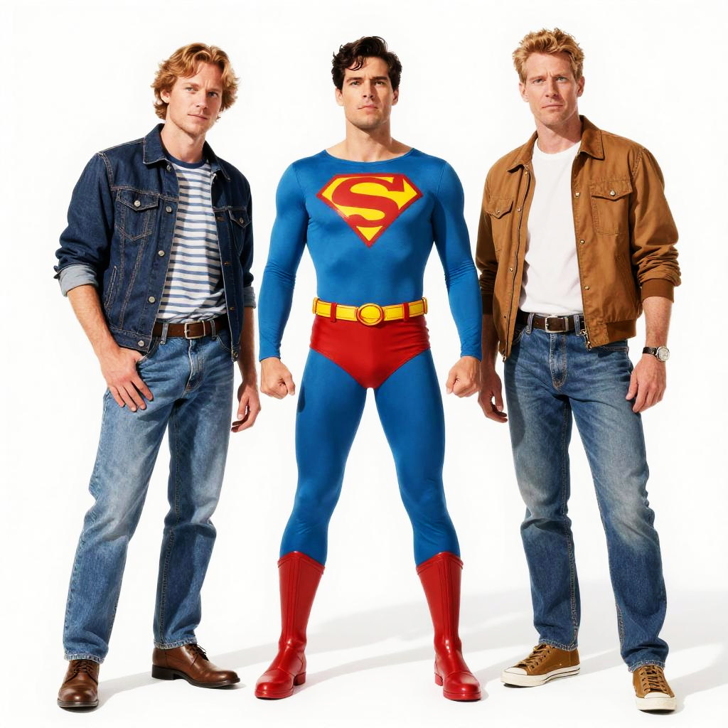 Photograph of three men: left in denim shirt and jeans, center in Superman costume with blue bodysuit and red boots, right in brown jacket