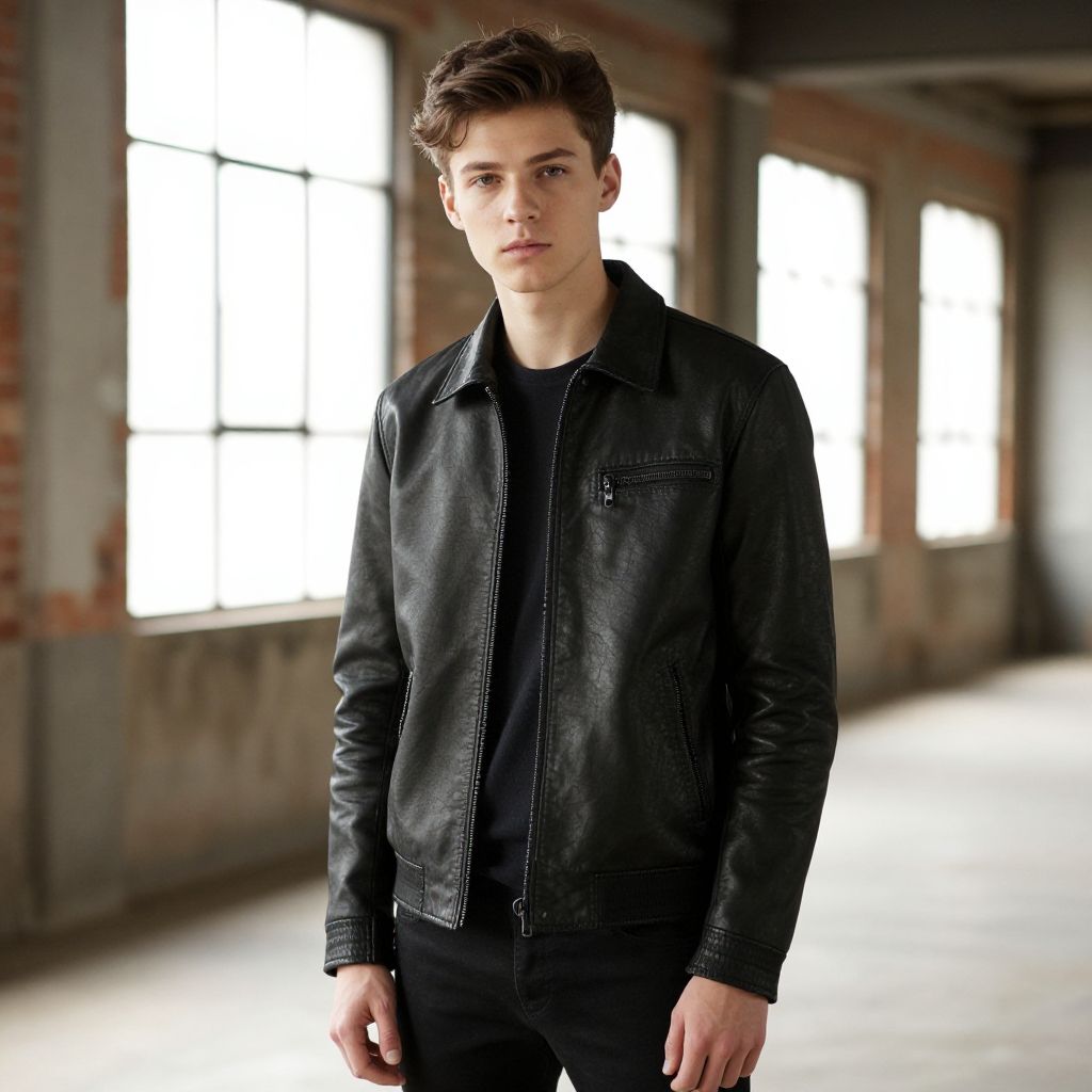 A young man with a confident expression poses in an industrial setting, characterized by exposed brick walls and large windows that allow natural light to enhance the scene. He is dressed in a stylish leather jacket, embodying a contemporary urban aesthetic.