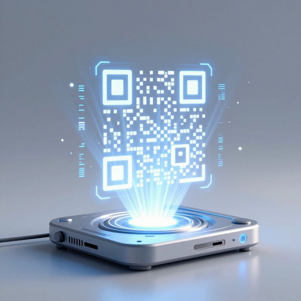 AI QR code generator depicted as an advanced holographic device emitting radiant light beams, QR codes forming mid-air with geometric precision, surrounded by data particles and digital code streams, futuristic minimalist environment with cybernetic aesthetics.