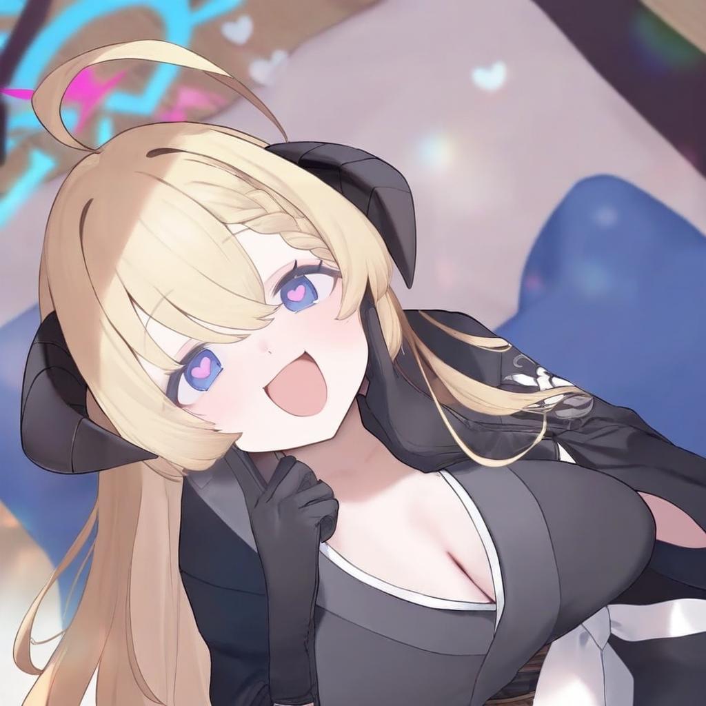 Akari (blue archive), blue archive, 1girl, demon horns, black horns, horns, blue eyes, hair between eyes, pink pupils, heart-shaped pupils, blonde hair, long hair, very long hair, ahoge, braid, large breasts, black kimono, black gloves, halo, blue halo, long sleeves, by artist shugao, leet