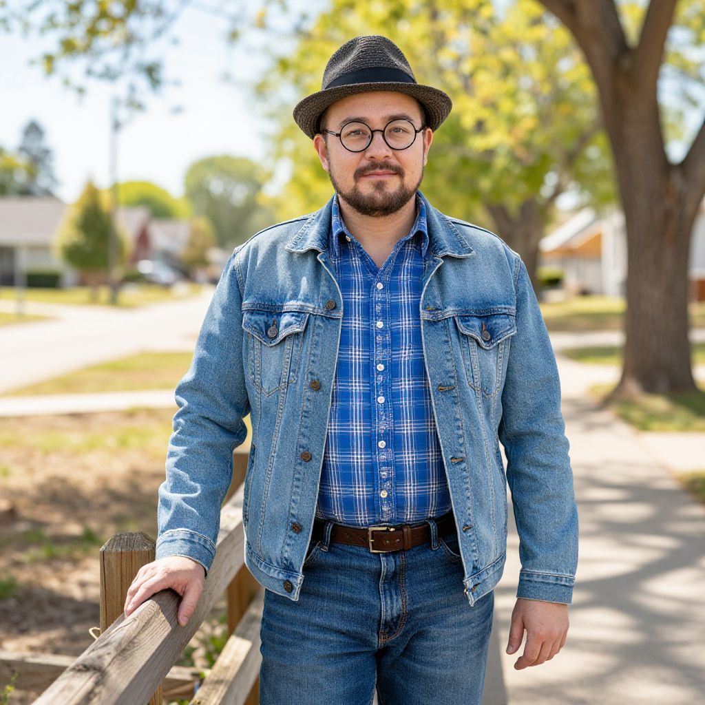 A man with round glasses and a classic fedora hat on his head, wearing a well-fitted blue shirt with a traditional plaid pattern, blue jeans, and a light blue denim jacket. He stands confidently in a sunny outdoor setting, with a relaxed expression, slightly leaning on a wooden fence. The background features a suburban landscape with trees and a distant street, adding warmth and depth to the scene.